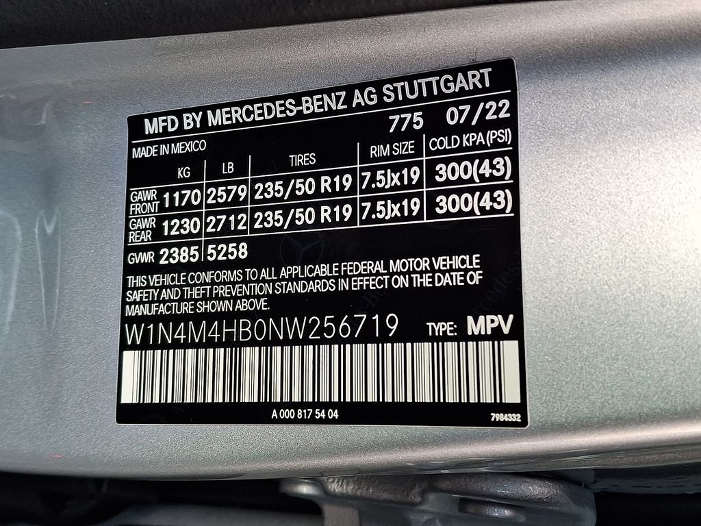 4-Wheel Disc Brakes, 8 Speakers, 8-Way Power Front Comfort Seats, ABS brakes, Air Conditioning, Alloy wheels, AM/FM radio, Apple CarPlay®/Android Auto®, Automatic temperature control, Axle Ratio: TBD, Brake assist, Bumpers: body-color, Child-Seat-Sensing Airbag, Delay-off headlights, Driver door bin, Driver vanity mirror, Dual front impact airbags, Dual front side impact airbags, Electronic Stability Control, Emergency communication system: Mercedes-Benz Emergency Call Service, Exterior Parking Camera Rear, Four wheel independent suspension, Front anti-roll bar, Front Bucket Seats, Front Center Armrest, Front dual zone A/C, Front fog lights, Front reading lights, Fully automatic headlights, Heated door mirrors, Illuminated entry, Knee airbag, Low tire pressure warning, MB-Tex Upholstery, Memory seat, Occupant sensing airbag, Outside temperature display, Overhead airbag, Overhead console, Panic alarm, Passenger door bin, Passenger vanity mirror, Power door mirrors, Power driver seat, Power Liftgate, Power passenger seat, Power steering, Power windows, Premium audio system: MBUX, Radio data system, Radio: Mercedes-Benz User Experience (MBUX), Rain sensing wipers, Rear anti-roll bar, Rear fog lights, Rear reading lights, Rear window defroster, Rear window wiper, Remote keyless entry, Roof rack: rails only, Security system, Smartphone Integration, Speed control, Speed-sensing steering, Split folding rear seat, Spoiler, Steering wheel mounted audio controls, Tachometer, Telescoping steering wheel, Tilt steering wheel, Traction control, Trip computer, Turn signal indicator mirrors, Variably intermittent wipers, Wheels: 7.5J x 18" Twin 5-Spoke.